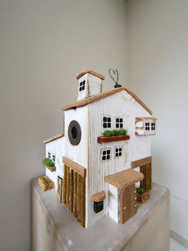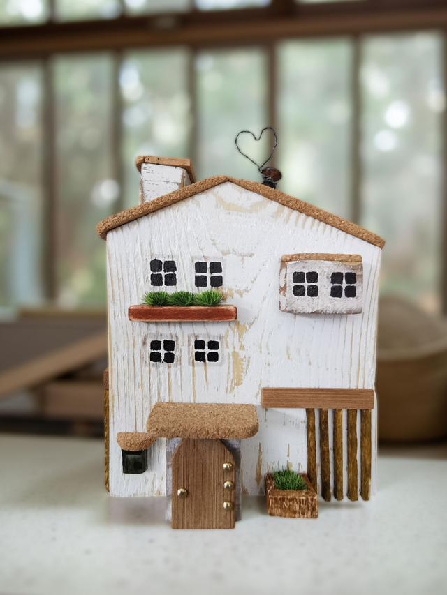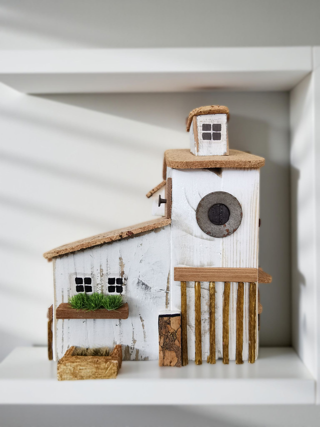 Cette jolie maison décorative est réalisée à la main à partir de bois recyclé et d’éléments naturels. Chaque détail est soigneusement travaillé : petites fenêtres peintes, toit en liège, échelle rustique et touches de verdure pour un charme authentique.